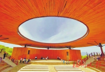 在高盖山森林公园西门,有一道长长的云梯,许多人相信,穿越石阶上的六重“乌头门”,可以实现美好的心愿。穿过云梯,一座仿照圆顶土楼建造的开放剧场便映入眼帘,非常适合打卡拍照。