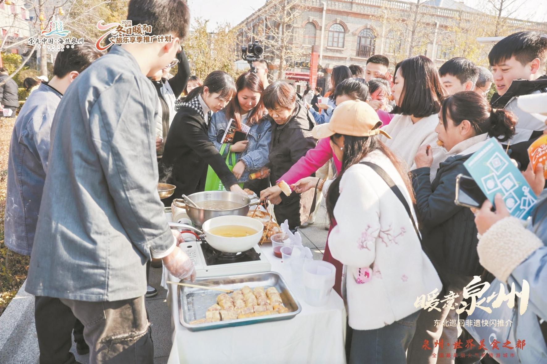 泉州小吃品鉴 非遗破圈 流动文化名片 “圈粉”东北民众 11月3日,沈阳中街,寒风中响起南音丝竹声,2025“暖意泉州”东北巡回非遗快闪推介活动正式启幕。活动打破非遗“博物馆式”静态展陈模式,让闽南文化直接走进北国冬日街头。 流动性非遗展演成为最大亮点。南音流淌唐宋雅韵,提线木偶跃动市井烟火,高甲戏丑角诙谐演绎民俗趣意,蟳埔女簪花围将海洋浪漫“别”在发间……“东北大爷大妈太热情了,看完高甲戏就围着咨询,说打算冬天到泉州走一走。”快闪成员、泉州市高甲戏传承中心演员柯舒萍介绍,她在吉林长春一座公园里偶遇跳广场舞的大爷大妈,他们主动要求合影并打听泉州小吃和气候,“能明显感受到东北中老年群体的市场潜力,他们有钱有闲且热爱传统文化,泉州的古街巷、慢生活和茶文化,特别契合他们的需求”。 烟火气是最好的“介绍信”。沈阳站现场架起灶台,海蛎煎、菜头粿、牛肉羹现做现尝,免费发放的“海丝风味盒”里,蒜蓉枝、麻粩等特色小吃让东北民众直呼过瘾。“面线糊配油条就是东北人暖心早餐的升级版,有家的味道,也有他乡的新奇感。”网红博主品尝后直言,泉州不仅带来了非遗,更把灶台搬到沈阳街头,把家的烟火气端到东北市民面前,这种沉浸式体验比千篇宣传文案都管用。