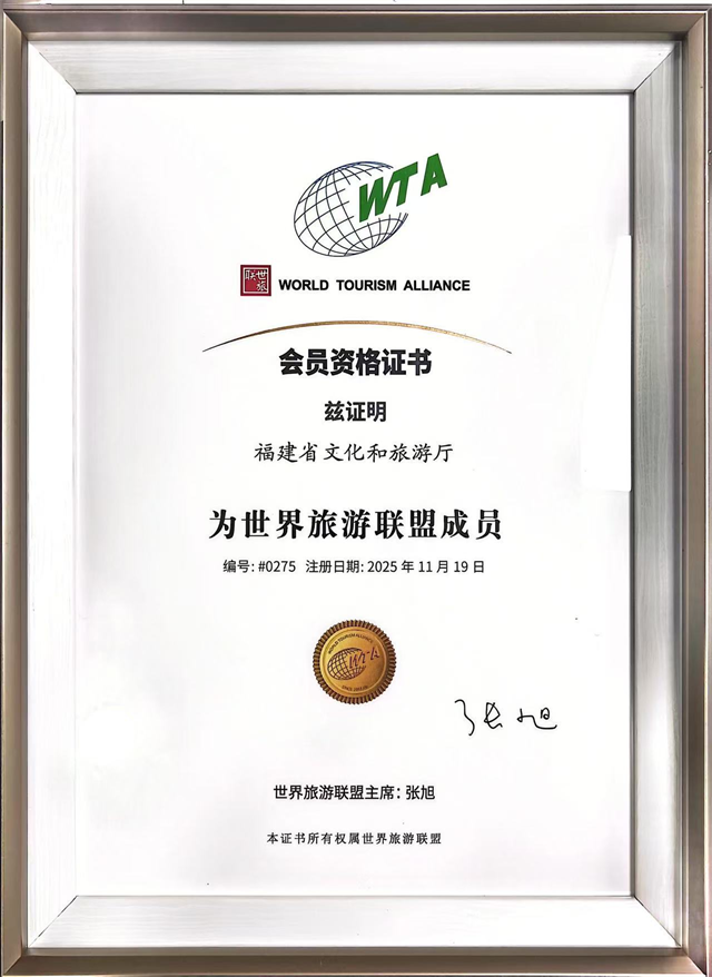 世界旅游联盟作为全球旅游业的重要组织,肩负旅游促进和平、旅游促进发展、旅游促进减贫的使命,致力于深化国际旅游交流与合作,推动全球旅游业互联互通和共享共治,促进全球旅游业可持续发展。此次年会审议通过了来自中国、土耳其、阿联酋、肯尼亚等7个国家和地区的15家机构加入联盟。新会员涵盖社会组织、城市和企业三大类别,福建省文化和旅游厅与澳门休闲旅游服务创新协会、土耳其旅游促进和发展局等7家单位共同入选社会组织类会员。省文旅厅副厅长肖长培上台获颁会员证书。 福建省山海交融、人文荟萃,素有“山海画廊、人间福地”的美誉,森林覆盖率连续46年位列全国首位,是中国大陆最绿的省份,水、大气、生态环境连年保持全优,是中国东南沿海的一颗璀璨明珠。拥有武夷山、福建土楼、(泰宁)丹霞、鼓浪屿:历史国际社区、“泉州:宋元中国的世界海洋商贸中心”等5处世界遗产,南音、妈祖信俗等10项人类非物质文化遗产名录,位居全国前列。海丝文化、闽南文化、客家文化、茶文化、妈祖文化、朱子文化、闽都文化、船政文化等地域特色鲜明,官洋村是2025年“世界最佳旅游乡村”,首届“东亚文化之都”泉州市近日又获得“世界美食之都”殊荣。